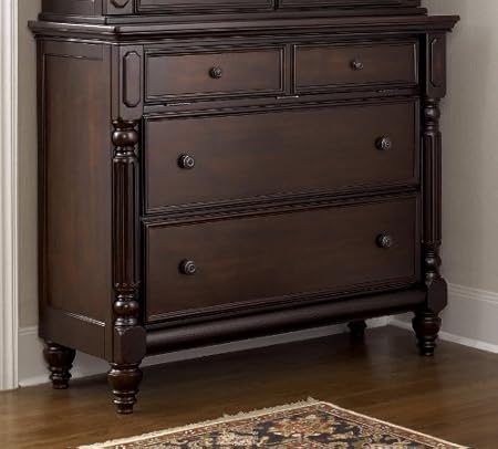The rich beauty of the "Key Town" bedroom collection features a sophisticated finish and ornate details to create a traditional designed collection that is sure to enhance any bedroom decor. The dark brown finish, flowing over the ash swirl accents, features a gentle distressing that perfectly complements the dark bronze color hardware and embossed recycled leather accents. With the shaped drawer front details and the shapely turned legs, this furniture collection is a shining example of inviting traditional design. Bring grand traditional style to life with the sophisticated details of the "Key Town" bedroom collection.