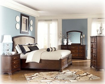 Series Features: Made with select veneers and hardwood solids in a dark brown finish. Cedar lined drawers. Full extension drawer glides. Serpentine shaped cases. Brushed nickel color hardware. Wood framed upholstered headboard with nail head detailing. Storage in footboard. French dovetail drawer construction. Hidden jewelry tray in dresser.