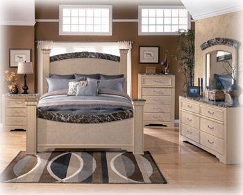 Series Features: Blond finish with replicated Oak grain accented with replicated Ash Burl grain. Towering poster bed with 3D pressed faux marble crown and keystone. Framed drawer fronts with dental molding detail. Pilaster case construction with bracket foot base cut-outs. Optional footboard storage requires B100-13 queen roll slat or B100-14 king roll slat. Faux marble case tops use 3D press technology for a rounded "infinity edgeTM". Side roller glides for smooth operating drawers.