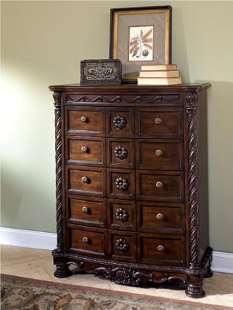 Made with select hardwood veneers, hardwood solids and furniture grade resin. Dark casual finish. Dark color Highlights hardware. rge scale decorative pilasters and ornately detailed appliques. Serpentine shaped drawer fronts. veneer or felt lined drawer bottoms. Dimensions: "Inches: 45""W x 19""D x 54""H"